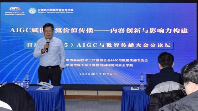 12月26日上午,首届(2025)AIGC与数智传播大会“AIGC 赋能主流价值传播:内容创新与影响力构建”分论坛在中传国际酒店顺利举办。本次分论坛由中国新闻技术工作者联合会AIGC与数智传播专委会主办、计算机与网络空间安全学院承办,我院院长林卫国教授担任主持人,旨在探索AIGC与主流价值传播体系的深度融合路径,以技术创新驱动内容生产模式变革,提升主流传播的传播力、引导力、影响力与公信力。技术科普:厘清AIGC作为新质生产力的核心逻辑论坛首个环节,中国传媒大学计算机与网络空间安全学院实践与创新服务中心主任王博以《理解新一代内容生产力》为题作主题分享。他从技术维度系统阐释了AIGC的内涵,梳理了AIGC从规则驱动、模板生成到基于大模型创造性生成的技术跃迁,强调这一演进正是其成为传媒领域“新质生产力”的底层支撑。针对AIGC应用中的幻觉问题,他提出“三角辩证法”多工具交叉验证方法,确保内容准确性;同时分享了“先大纲后成文”的引导式生成路径,以及根据创作阶段灵活选择“深度思考”或“标准模型”的实战技巧,为参会者提供了可直接落地的技术应用方法论。创作实践:探索主流价值内容的AIGC创新表达在创2025-12-27