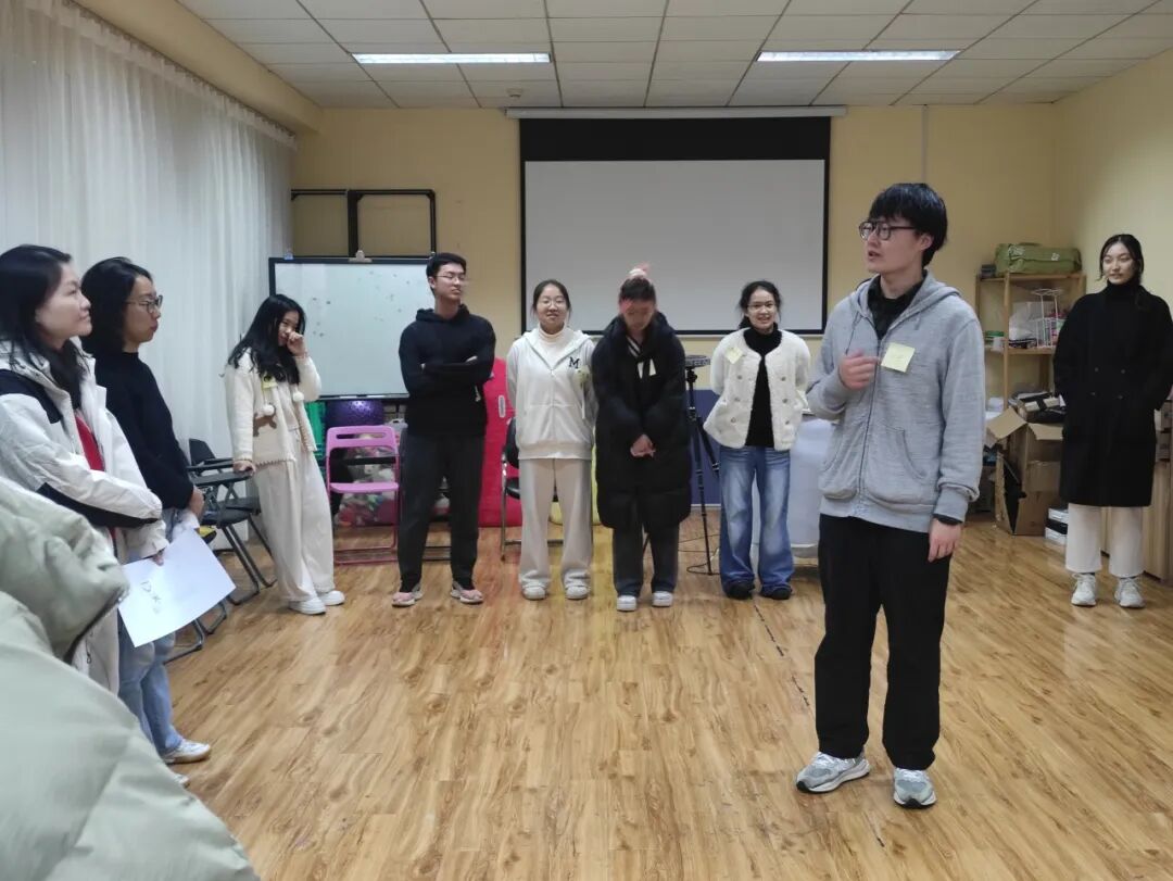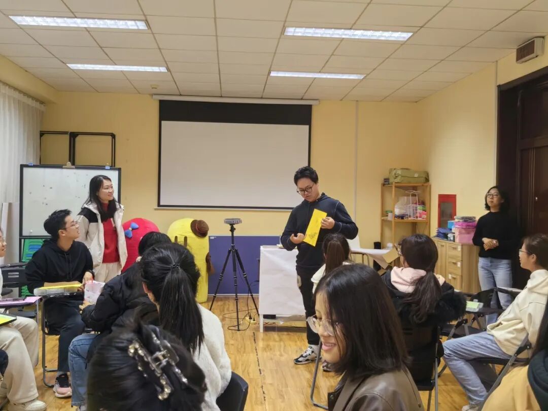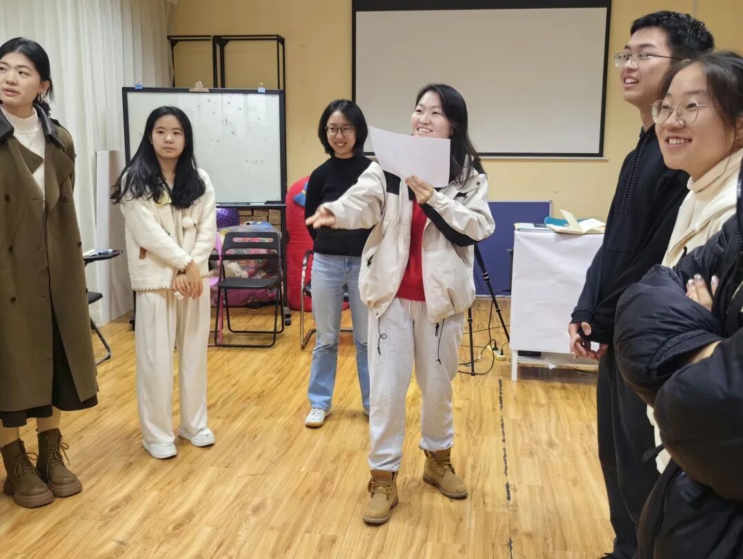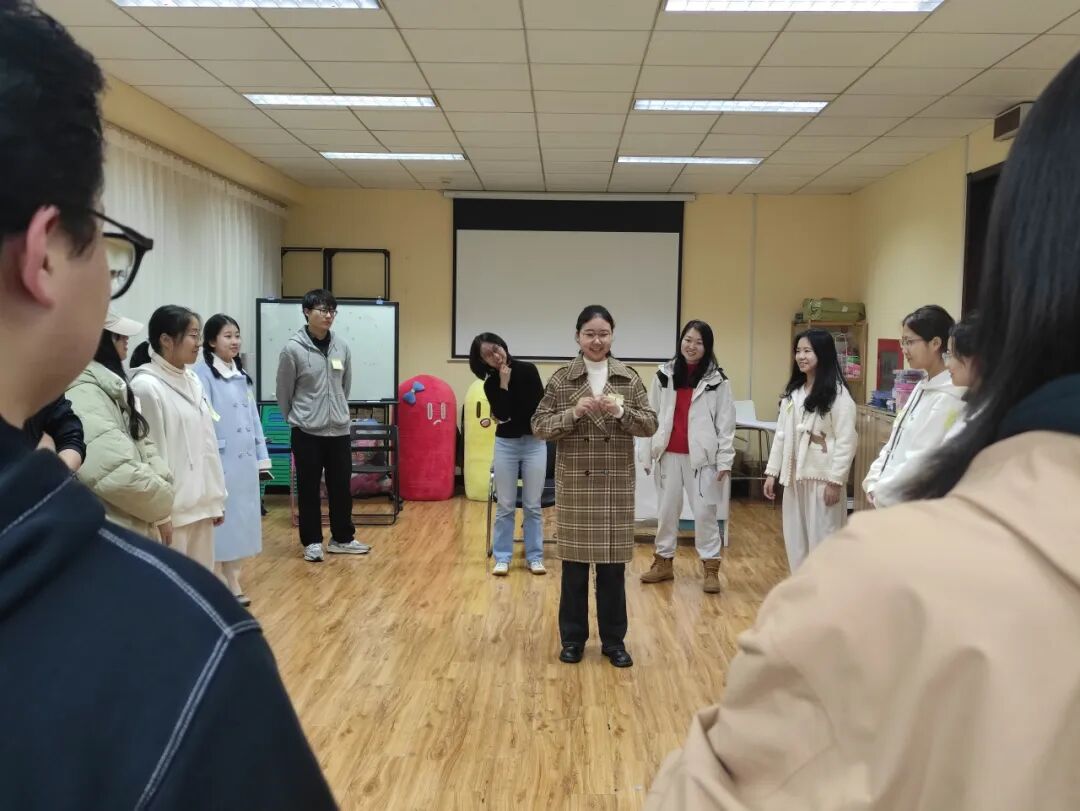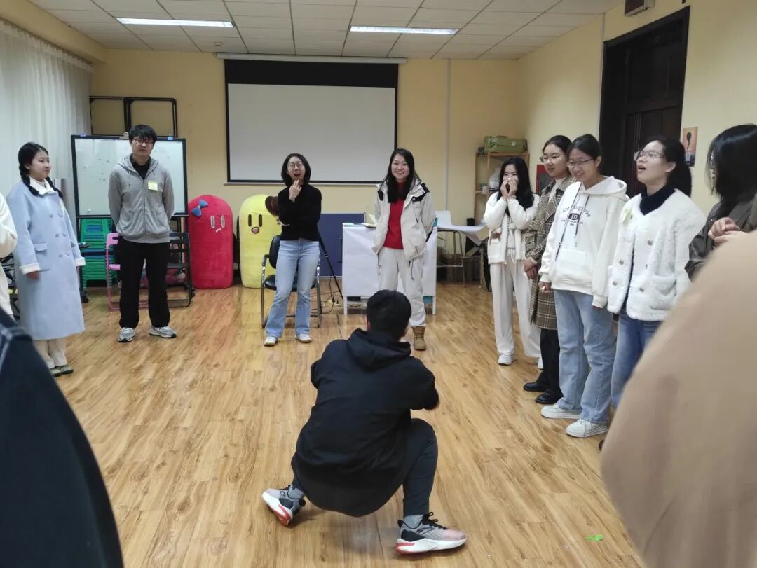 在热身阶段,大家围成一圈。每位同学抽取纸条,在不能出声的情况下用肢体、动作去描述纸条上的动物,传递它的特征。在看完其余团体成员的表演后需要对各自代表的动物进行体积大小的排序。