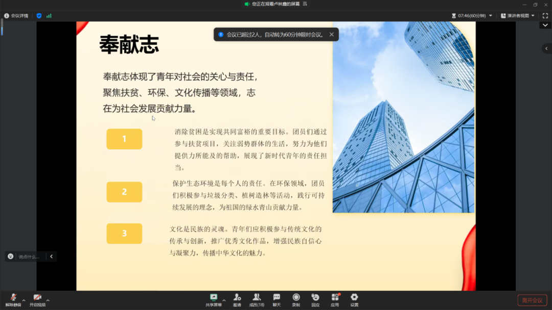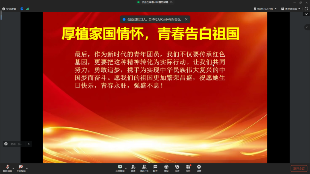 通过本次主题团日活动,同学们不仅深刻认识到了自己肩负的历史使命和社会责任,更激发了他们的爱国热情和奋斗精神。他们纷纷表示,要努力学习专业知识,提升综合素质,为祖国的繁荣富强贡献自己的力量。