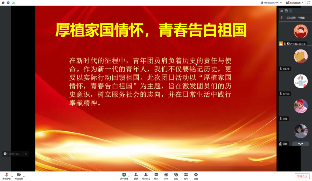 计算机与网络空间安全学院团委各基层团支部在国庆节开展主题团日活动,2024级电子信息专硕团支部圆满举办此次活动。在新时代的征程中,青年团员肩负着历史的责任与使命。作为新一代的青年人,我们不仅要铭记历史,更要以实际行动回馈祖国。此次团日活动以“厚植家国情怀,青春告白祖国”为主题,旨在激发团员们的历史意识,树立服务社会的志向,并在日常生活中践行奉献精神。