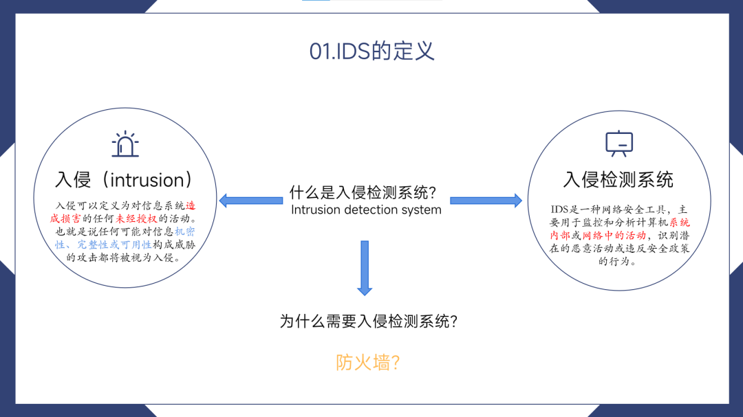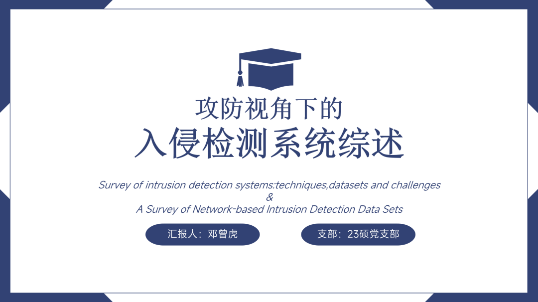 邓曾虎同志围绕入侵检测系统(IDS)展开,从防御和攻击的视角分别介绍了IDS的定义、分类、应用以及规避技术。在“防御”部分,首先解释了什么是入侵检测系统以及IDS的重要性,强调其在网络安全中的作用。接着,介绍了IDS的分类方法,包括基于入侵检测的工作原理进行分类,以及按不同的检测对象划分为网络和主机入侵检测系统。不同类型的IDS各自有其优缺点和适用场景。在“攻击”部分,主要分析了IDS的规避技术,包含分片和混淆等方法,这些技术可以通过分割数据包或改变数据格式来规避IDS检测。