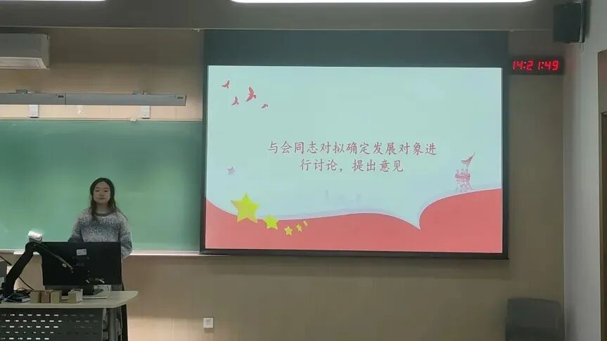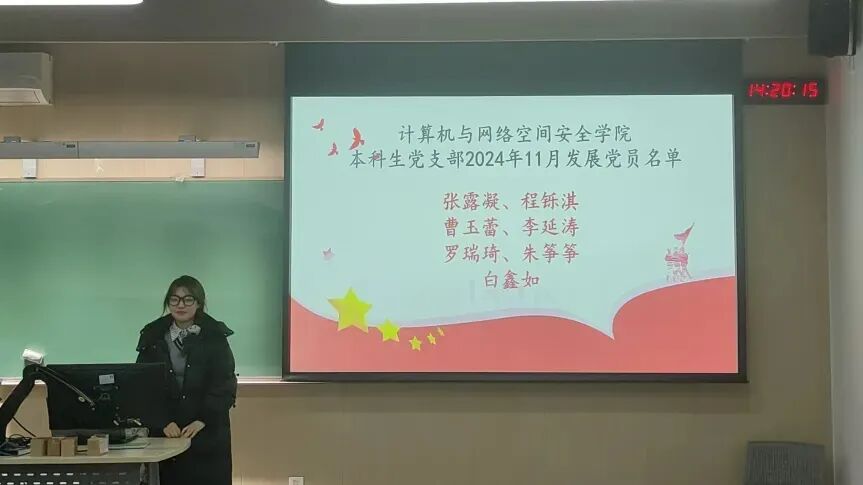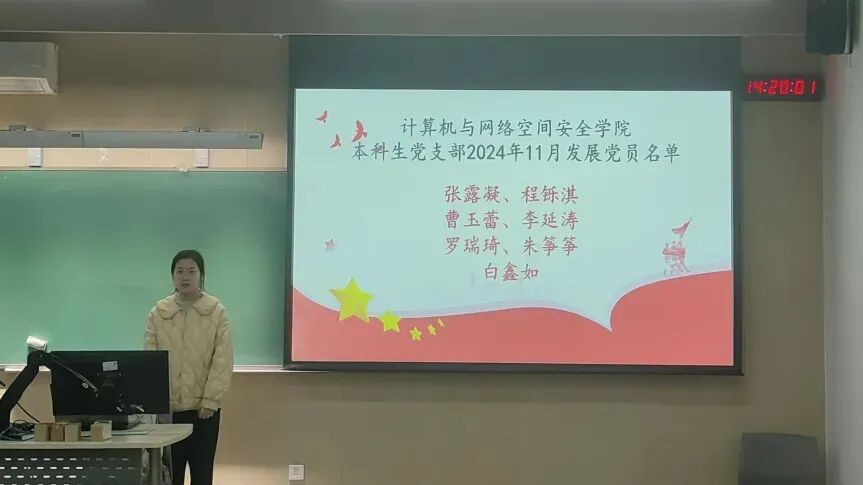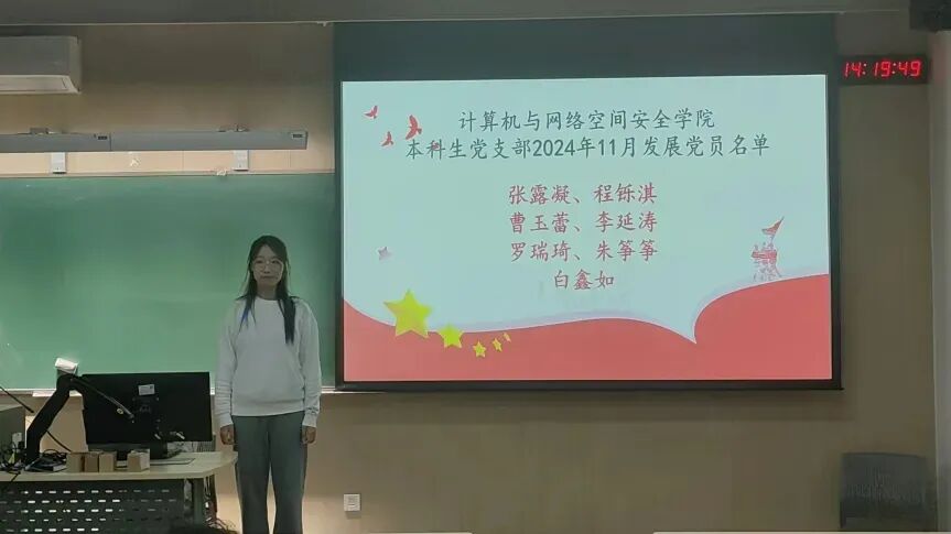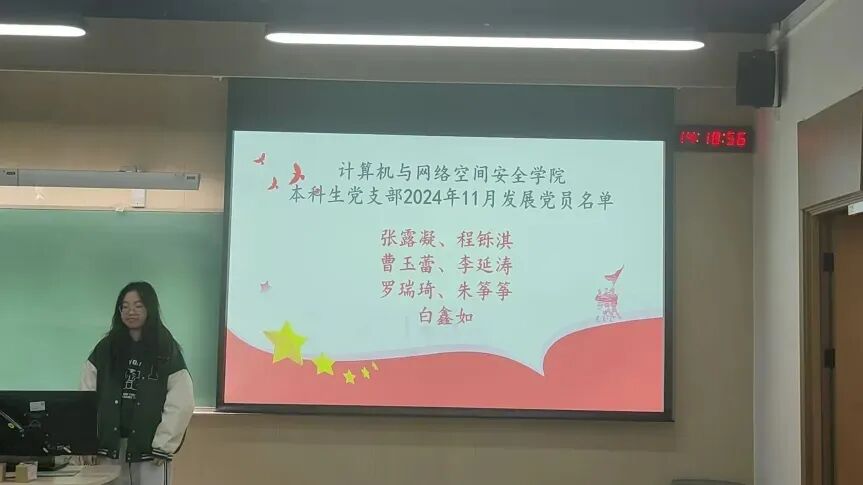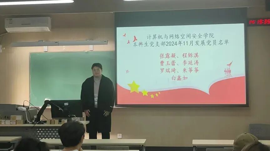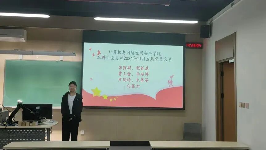 2024年11月13日下午3时,为贯彻落实党员发展工作指导思想,做好发展党员工作,中国传媒大学计算机与网络空间安全学院本科生党支部召开了预备党员发展大会,由党支部书记主持,会议内容为讨论张露凝、程铄淇、曹玉蕾、李延涛、罗瑞琦、朱筝筝、白鑫如7名同志发展成为预备党员的表决决议。