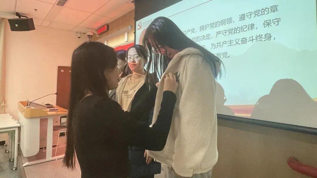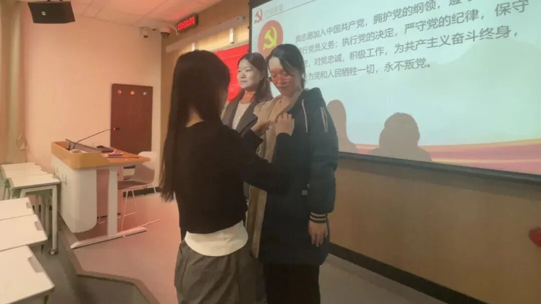 为增强学院9名新加入预备党员的责任感与传承精神,正式党员为新加入预备党员佩戴党徽。