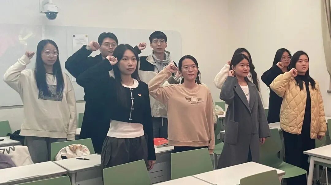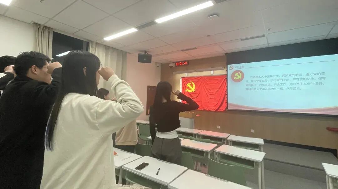 正式党员董芳瑜作为领誓人,带领学院9名新加入的预备党员面对党旗庄严宣誓。
