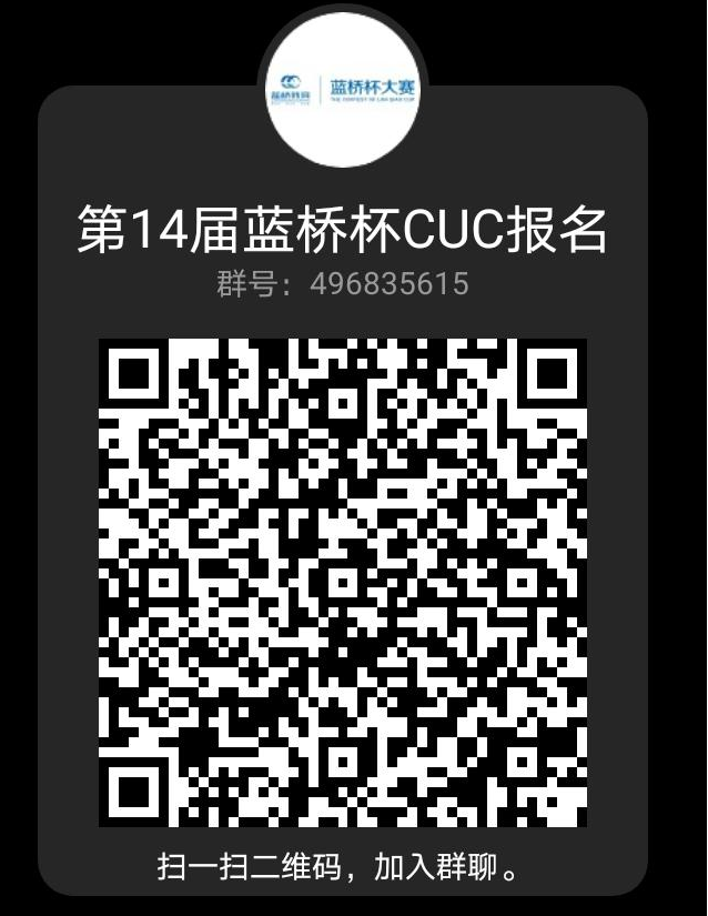 有意参加软件类比赛的同学请务必加入CUC第十四届蓝桥杯报名比赛QQ群: 496835615