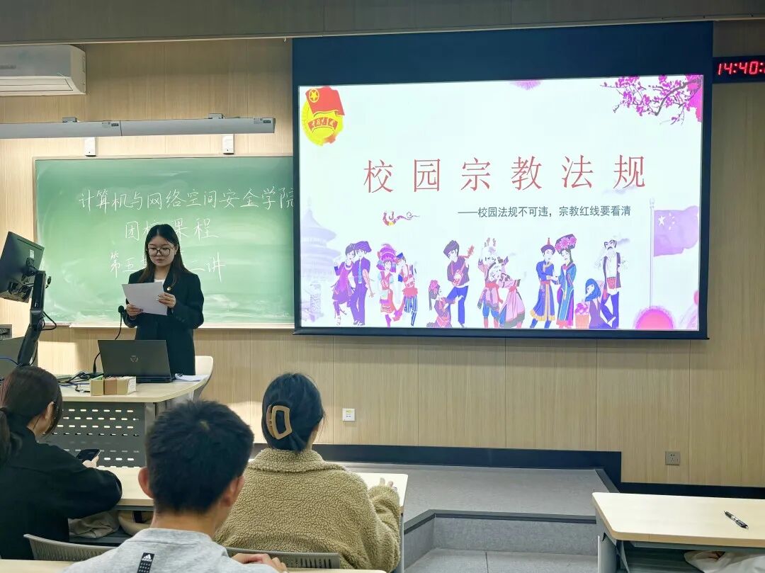 法治是校园和谐稳定的保障,主讲人强调了校园宗教活动应遵循的规范。她指出,作为新时代的大学生,团员应在法律框架内坚定信仰,做到既尊重信仰的多样性,又维护制度的权威性。通过学习,团员们认识到在校园中遵守法律法规不仅是自我保护的需要,也是营造和谐校园环境的重要途径,进一步明确了自身在规则之下的责任与担当。