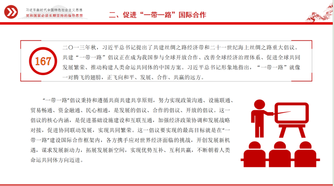 我们学习了“一带一路”倡议的深远意义,学习了深化“一带一路”国际合作的前进方向和根本遵循。我们深刻领悟到,应深入贯彻“一带一路”精神,推动共建“一带一路”实现更高质量、更高水平的新发展,建设一个开放包容、互联互通、共同发展的世界。