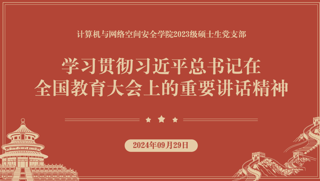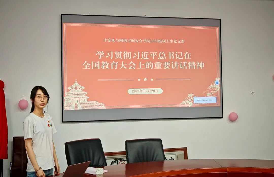 2024年9月29日下午,中国传媒大学计算机与网络空间安全学院2023级硕士生党支部在线上线下开展了“学习贯彻习近平总书记在全国教育大会上的重要讲话精神”九月党课学习会。此次会议由党支书裴雨晨同志主持,共计18名学生党员参加。