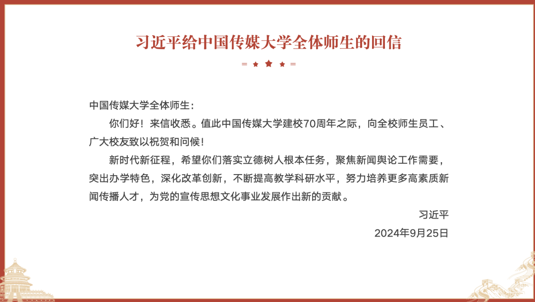 近日,中共中央总书记、国家主席、中央军委主席习近平给中国传媒大学全体师生回信,在中国传媒大学建校70周年之际,向全校师生员工、广大校友致以祝贺和问候。