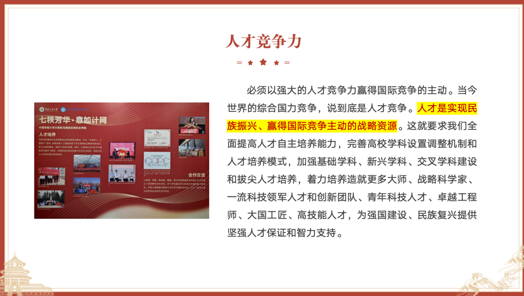 须以强大的人才竞争力赢得国际竞争的主动。人才是实现民族振兴、赢得国际竞争主动的战略资源。这就要求我们全面提高人才自主培养能力,完善高校学科设置调整机制和人才培养模式,加强基础学科、新兴学科、交叉学科建设和拔尖人才培养。