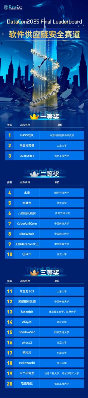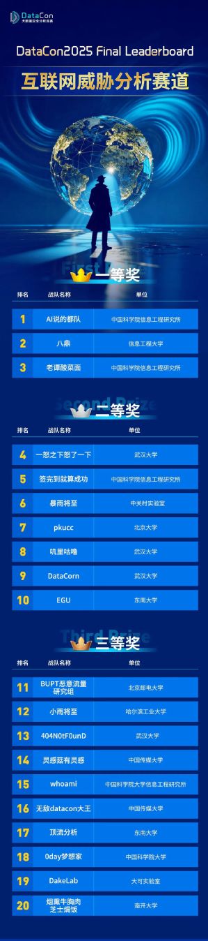 近日,由清华大学网络科学与空间研究院、奇安信集团、蚂蚁集团、腾讯安全应急响应中心联合主办,西安交通大学、复旦大学、南开大学等多所知名高校及企业协办的DataCon2025大数据安全分析竞赛圆满落幕。作为大数据安全领域极具影响力的“产学研”融合赛事,本届竞赛以高规格、高难度、高含金量成为检验安全人才实力的重要标杆。