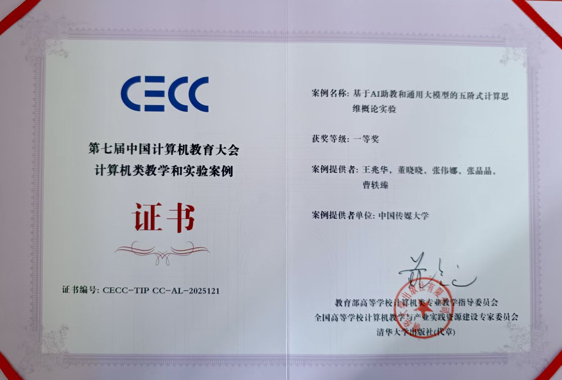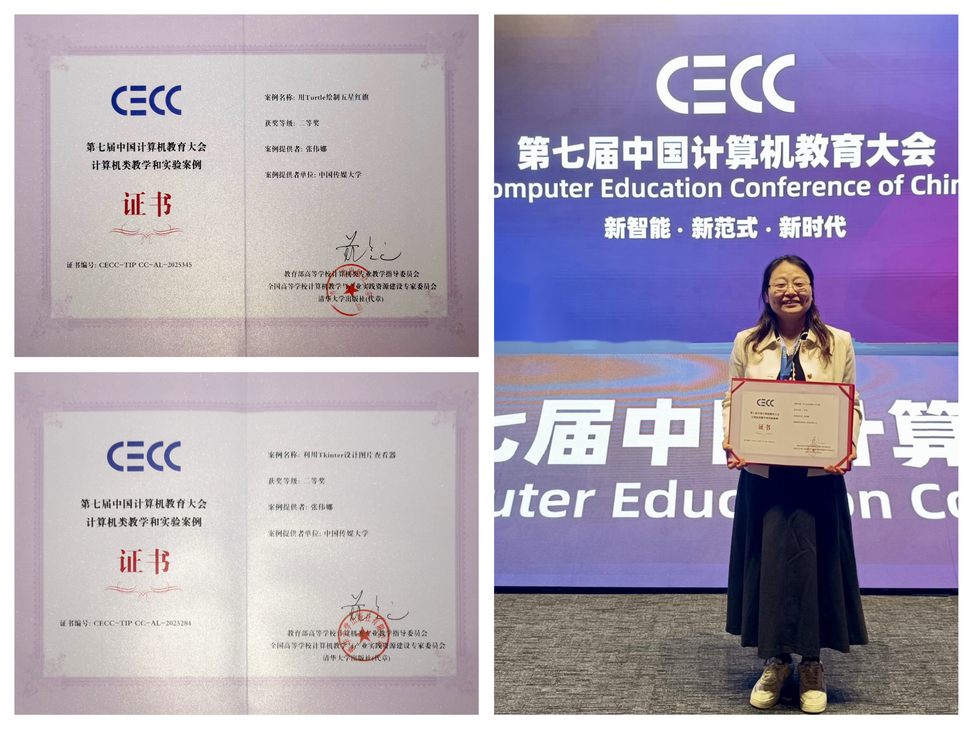 11月28日至30日,第七届中国计算机教育大会(CECC)在厦门召开。计算机与网络空间安全学院计算思维课程组团队教师凭借深耕教学实践的扎实积累与聚焦传媒特色的创新设计,在大会计算机类教学和实验案例评选中脱颖而出,斩获一等奖1项、二等奖2项。