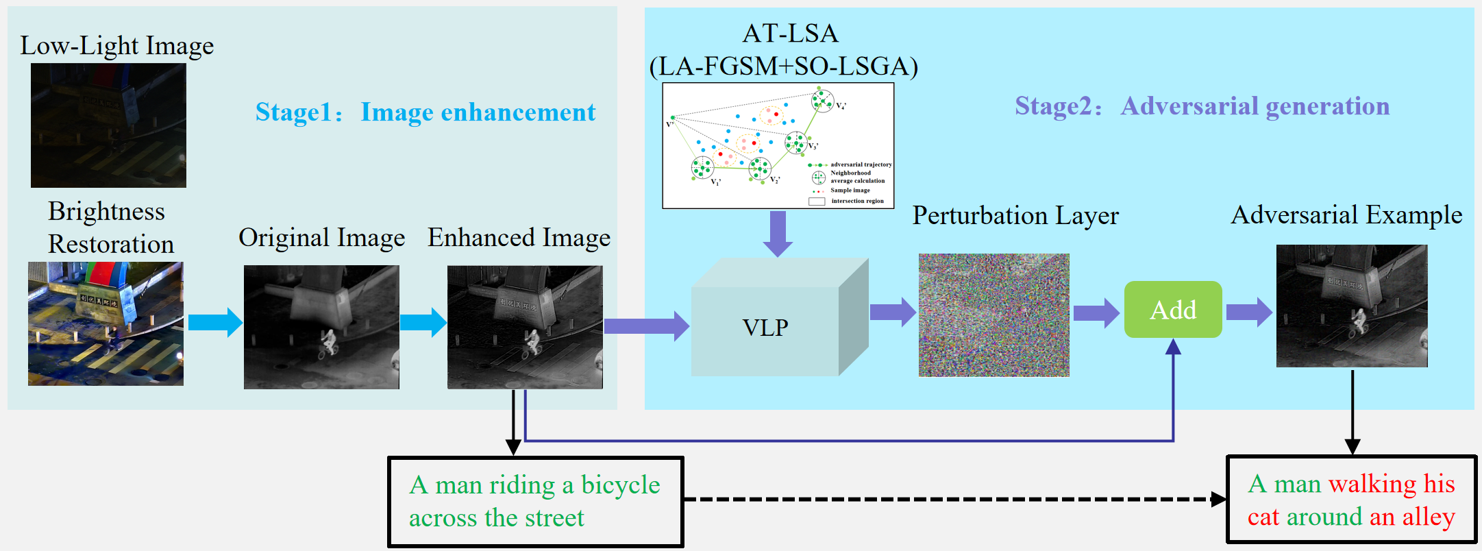 针对上述问题,我院科研团队从攻击评估视角切入,系统分析红外对抗扰动对多模态感知系统的潜在影响,创新性提出并构建“红外图像增强+对抗样本生成”两阶段研究框架。其中,所设计的红外图像增强方法可显著提升VLP模型对红外场景的语义理解与表征能力;同时,在对抗扰动生成过程中,有助于获得更稳定的梯度信号与更丰富的可攻击结构,从而提升扰动优化的有效性与可控性。在此基础上,团队进一步提出AT-LSA算法,用于生成高质量对抗样本。实验结果表明,该算法通过迁移攻击成功揭示了VLP模型在红外场景下的潜在脆弱性;同时,针对GPT等闭源模型的迁移攻击也取得了良好效果,为后续红外多模态系统的鲁棒性设计提供了重要依据。
