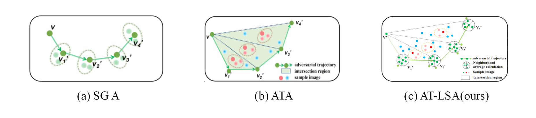 对抗样本生成过程的对比:(a) SGA, (b) ATA和(c) AT-LSA (ours)