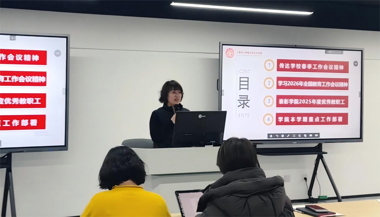 春启新程,逐光而行。3月4日下午,计算机与网络空间安全学院在44号楼212多功能实验室召开2026年春季学期全体教职工大会。恰逢学院顺利乔迁新办公空间,全体教职工齐聚新环境、共话新发展、共谋新蓝图。学院党委书记王淑娟,院长兼党委副书记林卫国,党委副书记宋佳,副院长张晶晶,信息科学与技术学部副学部长黄祥林、刘杰锋出席会议,全体教职工参加会议。会议由王淑娟书记主持。