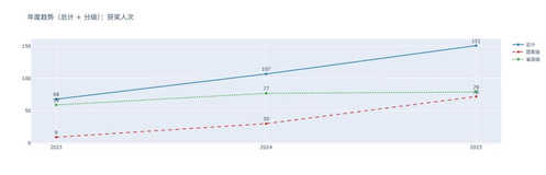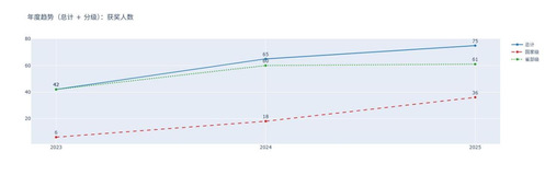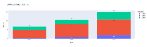从奖项等级整体分布来看,2025年二等奖人次显著增加,一等奖、三等奖人次稳步跟进,呈现中间厚、两头稳的健康态势。