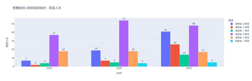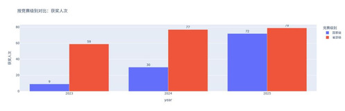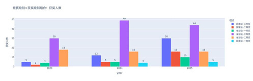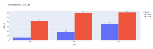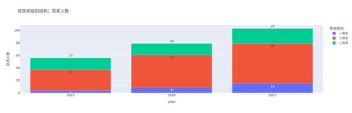 获奖人数按等级分布同样呈现积极变化,2025年各等级获奖人数均有增长,尤其是二等奖获奖人数增幅明显,说明更多学生正在从三等奖向更高等级迈进。